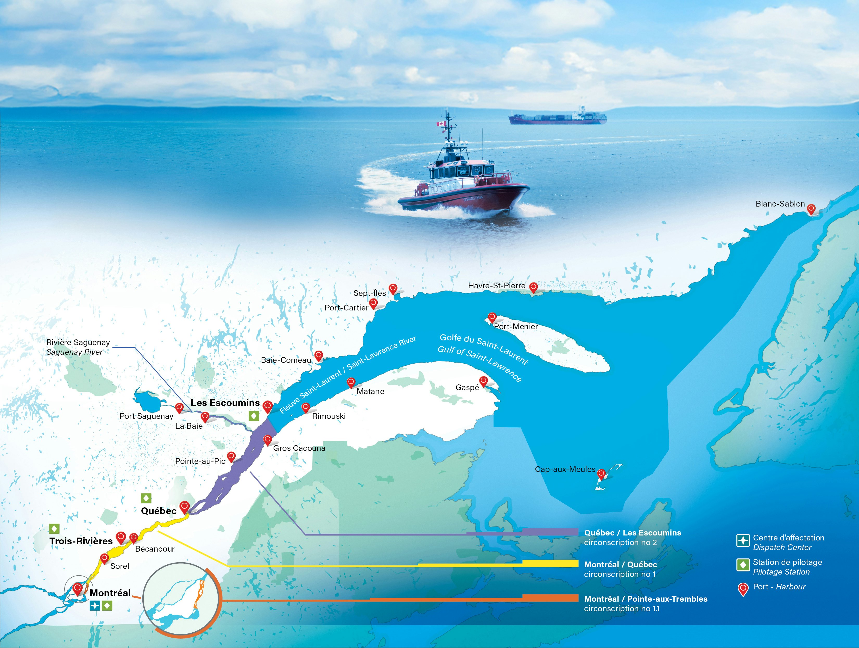 Nous gérons une zone de pilotage obligatoire divisée en trois circonscriptions couvrant une superficie de plus 265 milles nautiques entre Montréal et Les Escoumins, et de 70 milles nautiques sur la rivière Saguenay.