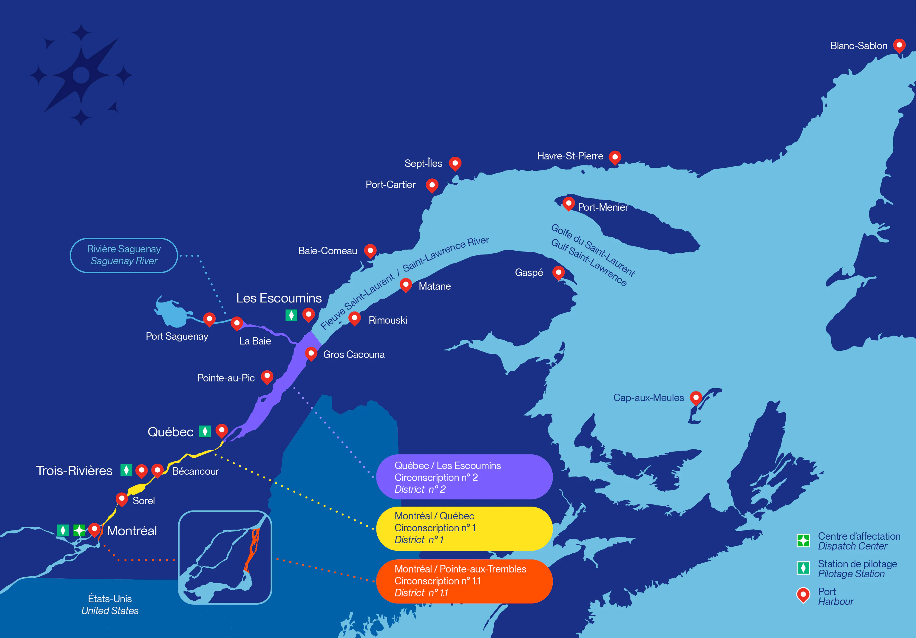 Nous gérons une zone de pilotage obligatoire divisée en trois circonscriptions couvrant une distance de plus de 265 milles nautiques entre Montréal et Les Escoumins, et de 70 milles nautiques sur la rivière Saguenay.